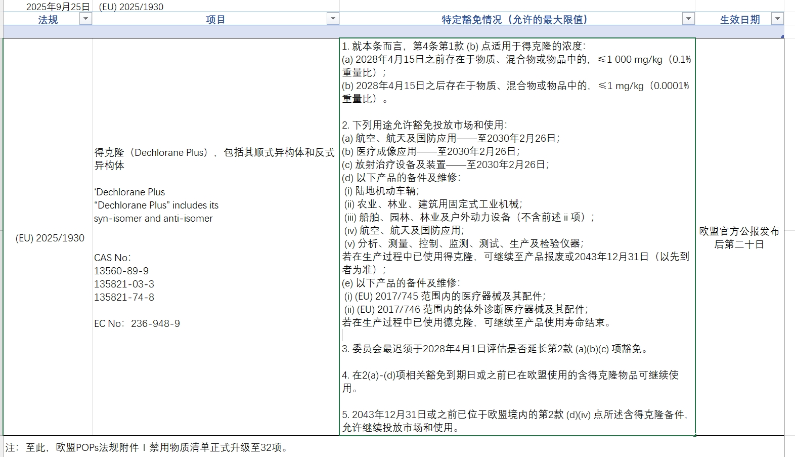 【法规更新】 2025年9月25日,欧盟在其官方公告上发布(EU)2025/1930条例,正式将德克隆纳入POPs法规限制清单。至此,欧盟POPs法规附件I 禁用物质清单正式由31项升级到32项。针对本条法规的更新,恒方大产品均可满足POPs法规。